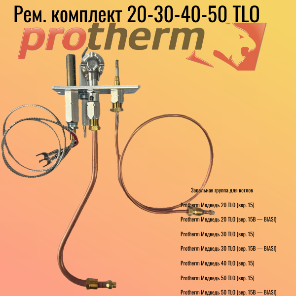 Термогенератор(многократная термопара) 0020027521,запальная(пилотная) горелка в сборе с соплом , электродом и фитингами 0020027524; термопара контроля пламени 0020027659; трубка пилотной горелки с обвальцованными фитингами 0020044700.